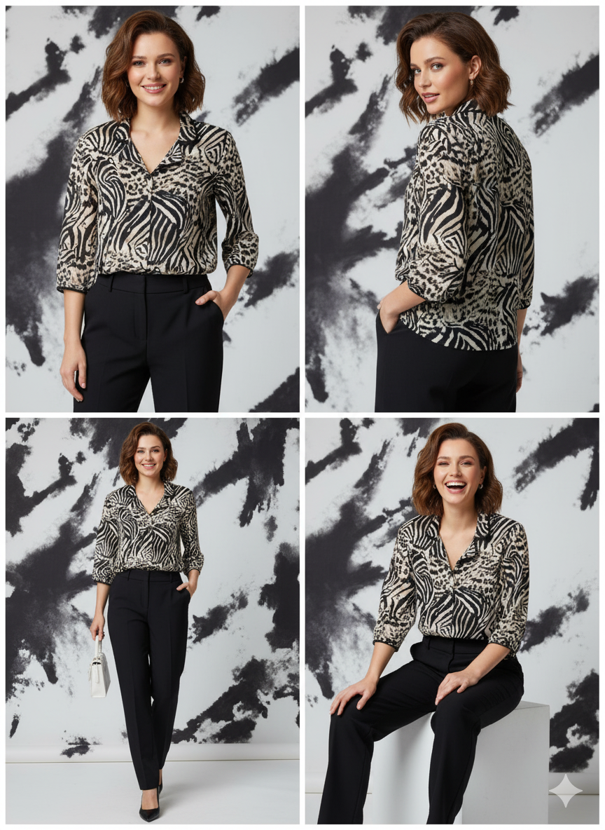 Estampado: Diseño audaz que combina las rayas de Cebra y las manchas de Leopardo en tonos neutros (negro y beige).