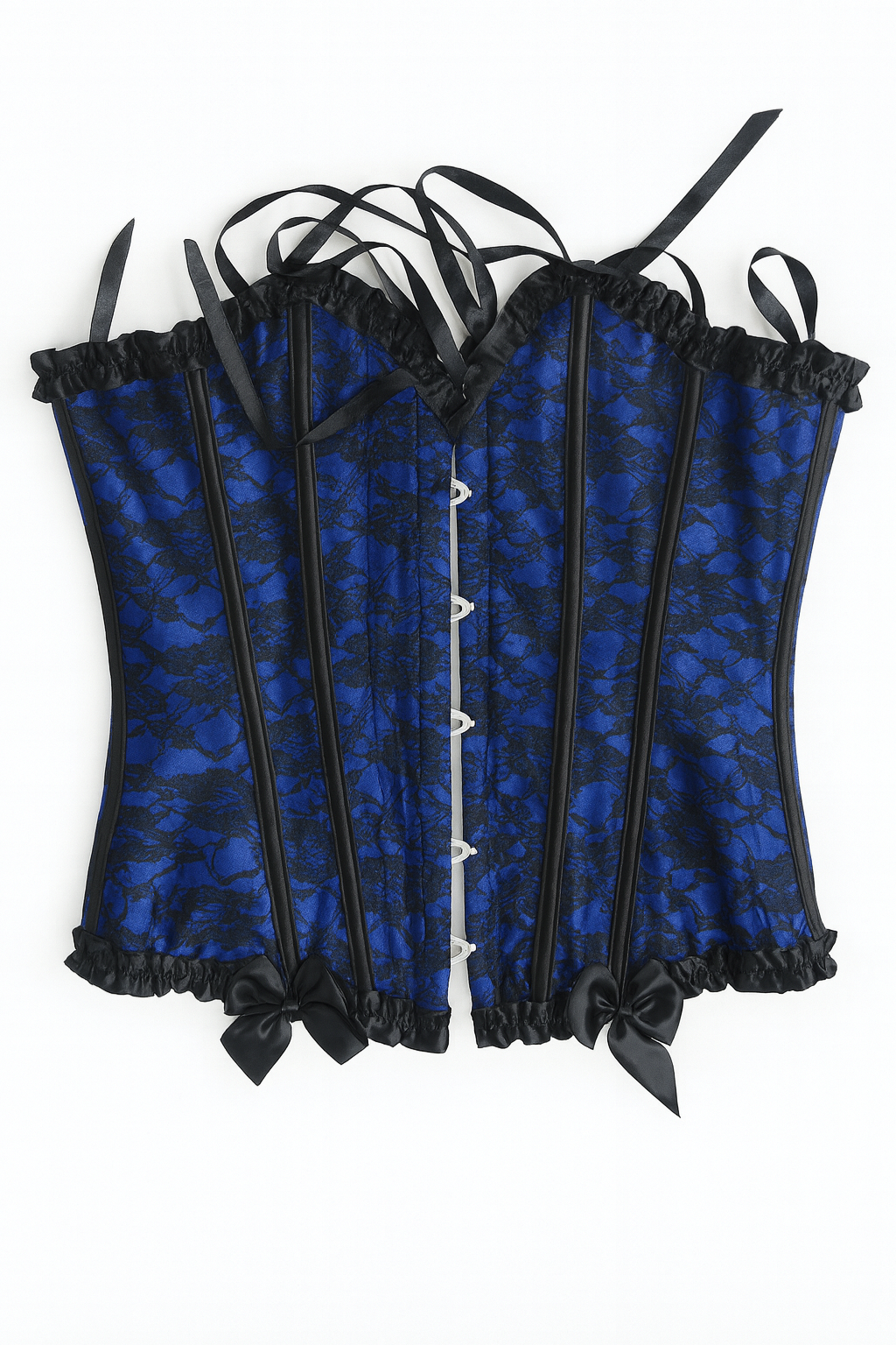 Estilo y Corte: Impresionante corsé completo (overbust) con estructura de varillas para moldear la figura. Diseño atrevido con tela base azul vibrante y encaje negro. Perfecto para fiestas.